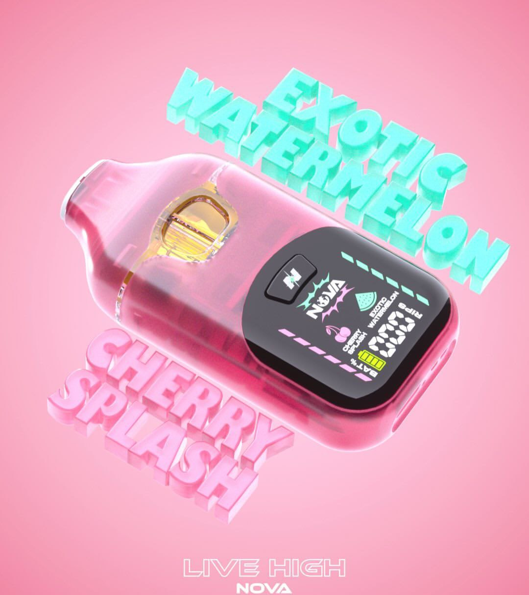 Nova Cherry Splash + Exotic Watermelon Disposable 2G delivers dual-fruit flavor fusion with premium cannabis oil, rich terpene profiles, and smooth, potent hits in a sleek, high-performance device.